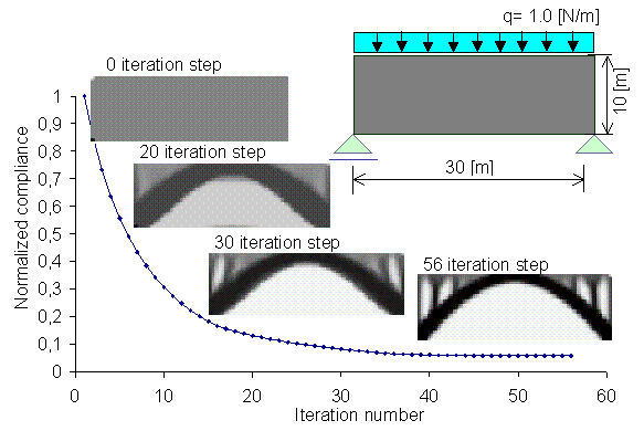 Topology optimization-iteration path and the material distribution in plain stress slab subjected to in-plane, distributed load in the middle of the height